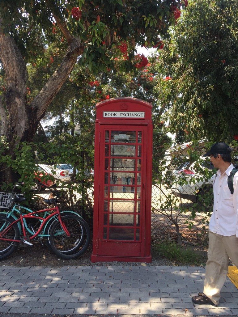 I am a hipster. After a quick Google search on things to do in Santa Barbara, this artistic cultural neighborhood, deemed The Funk Zone, piqued my interest. I sought out those art murals and took a few photos of my mom. Saw the cute library in the back in the red telephone booth.