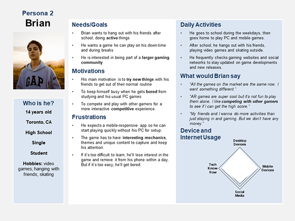 Once I had a better understanding of the users’ needs and wants, two primary personas were identified representing the target user demographics: Brian and Christine (named after two of my user interviewees!)