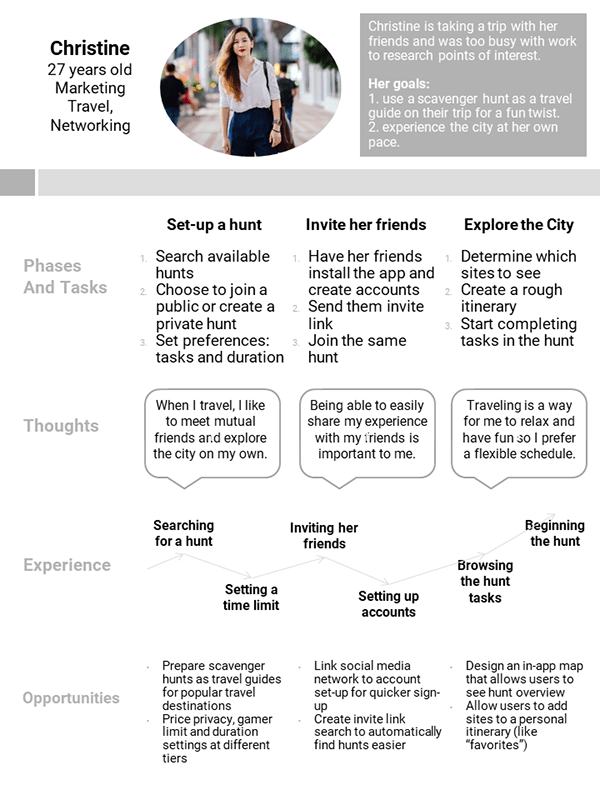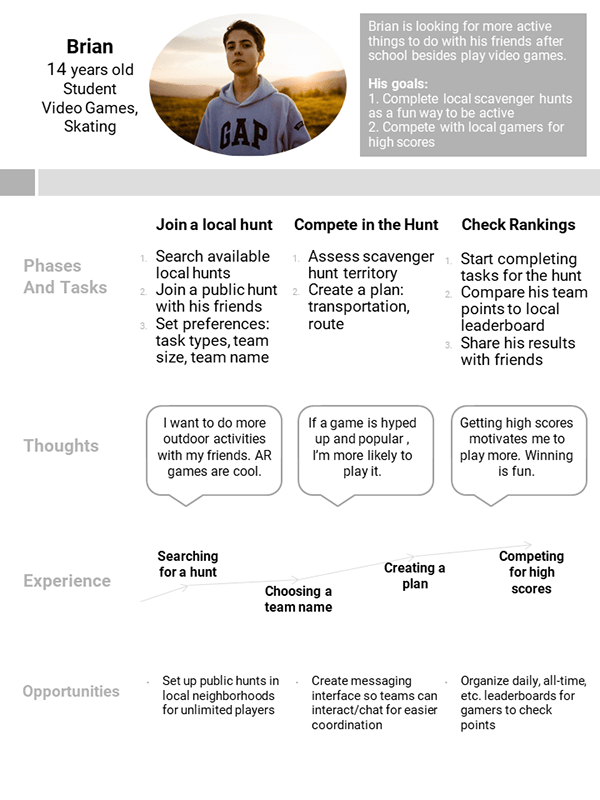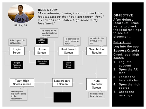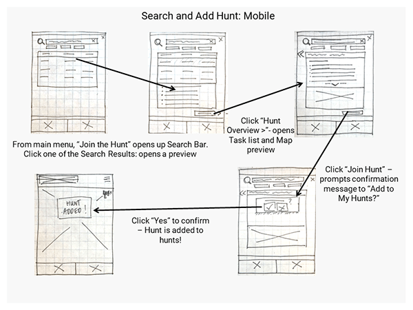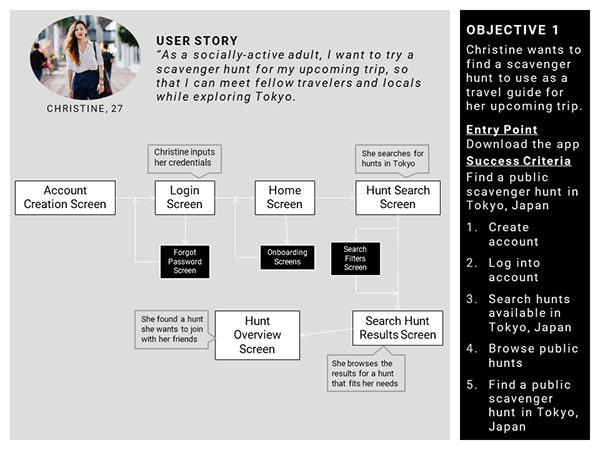 User stories were created to highlight users expectations from a scavenger hunt app and to connect with our potential users on a tangible level.