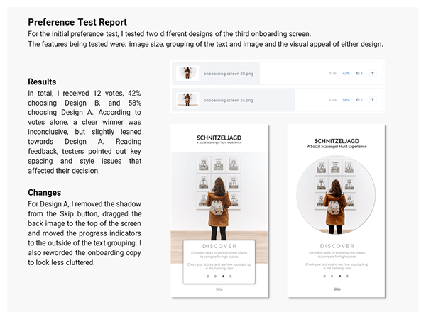 Once I had a viable lo-fidelity prototype, I began usability testing. Testing uncovered user pain points, my personal bias and the benefit of rapidly prototyping reinforced this idea: design does not need to be perfect, it needs to be functional. Continuing to iterate my prototype, I conducted preference tests to further validate my design decisions and gather more insights.