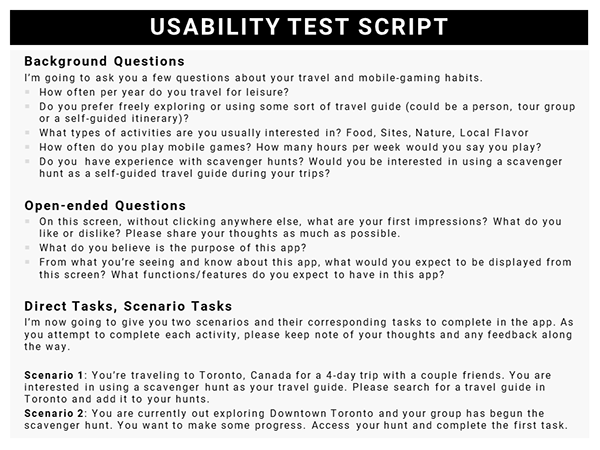 From here, I created a script and conducted in-person interviews with three people that fit the target audience: frequent travelers and gamers proficient with mobile apps.